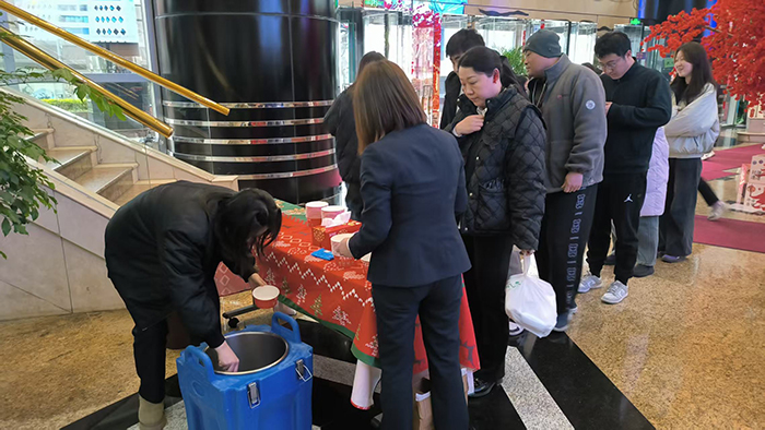 科技京城志愿者們早早地準(zhǔn)備好熱氣騰騰的湯圓,在樓宇大堂處等候,為每一位路過的業(yè)租戶送上節(jié)日的祝福。